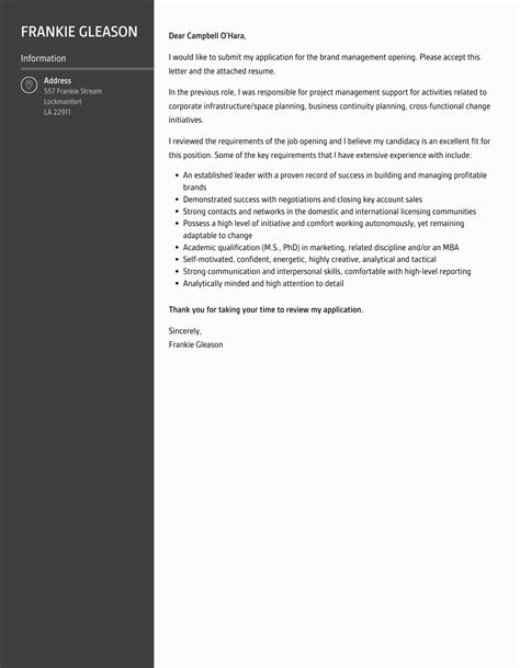 Brand Management Cover Letter - Vetted by career experts at enhancv. A hiring manager explains why. Professional brand manager cover letter samples from real job applications. 13 brand manager cover letters. As a brand manager, your cover letter body should focus on demonstrating your ability to develop and implement effective brand strategies.